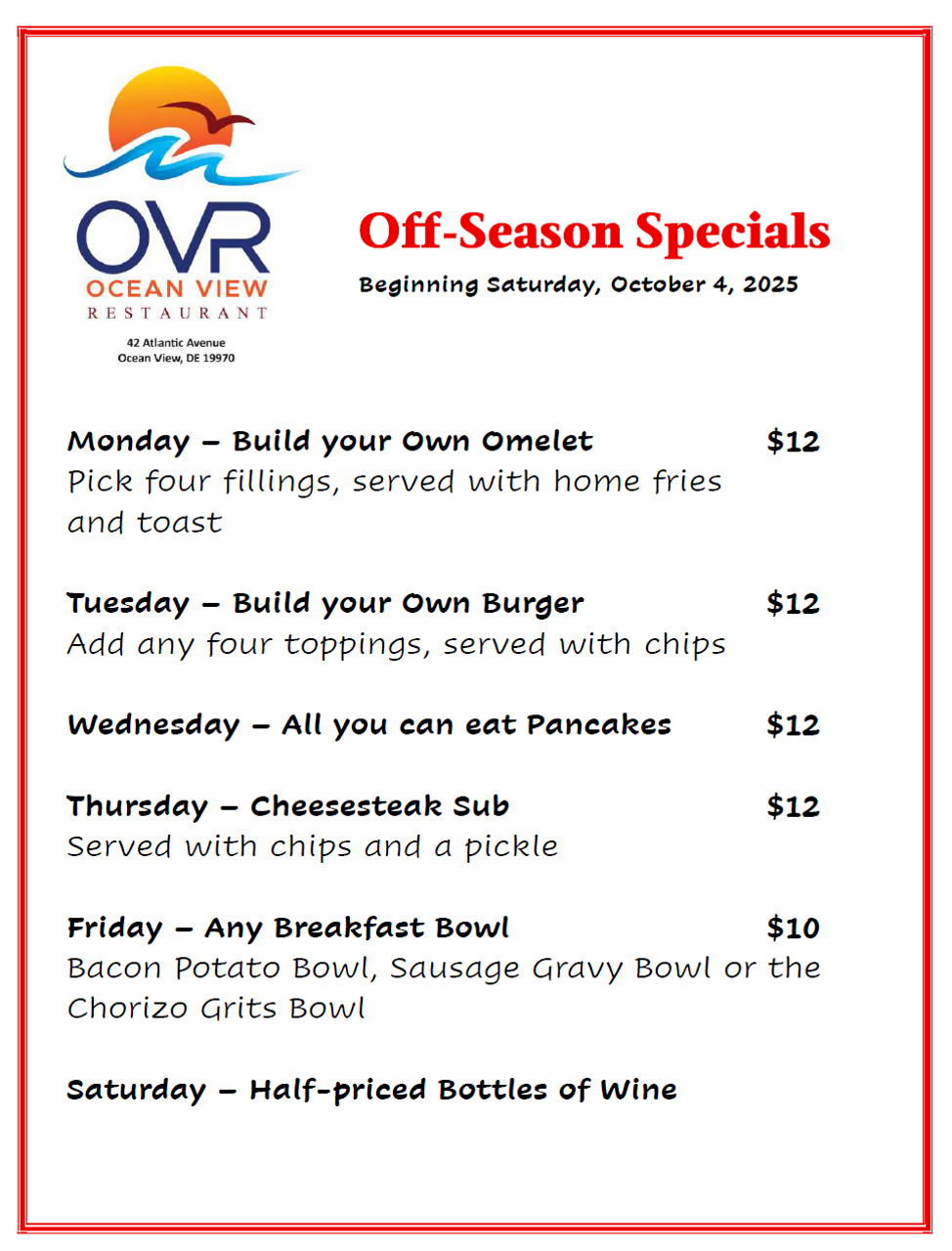 Ocean View Restaurant, formerly Ocean View Family Restaurant and Ocean View Deli & Restaurant, has been serving home-style meals for over 30 years! Located in the heart of Ocean View Delaware, in an old house.